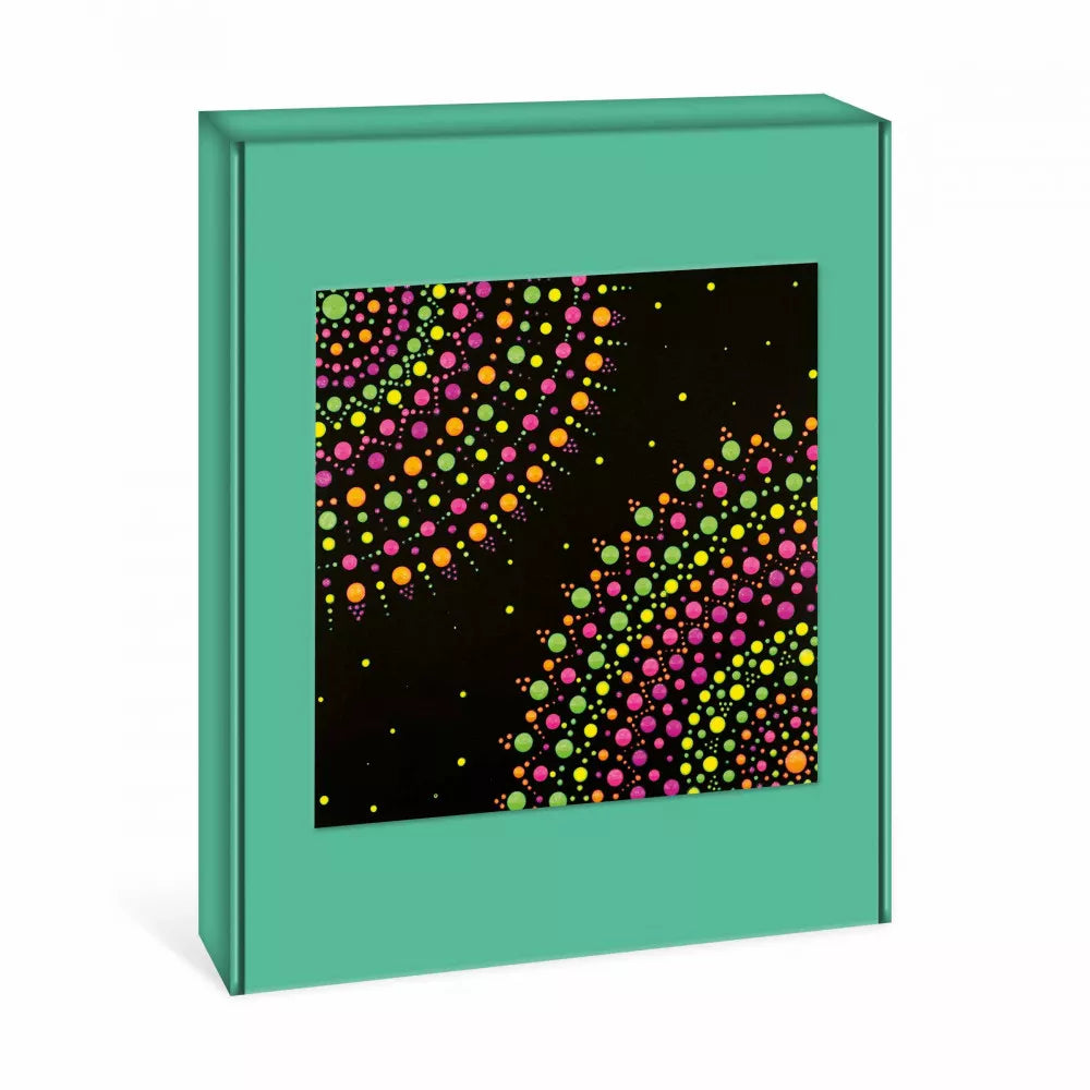¡Da vida y color a los cuadros negros con la técnica de la pintura con puntos, la última tendencia! Este estuche creativo permite decorar 4 cuadros negros y un canto rodado con puntos de pintura en relieve de diferentes tamaños. El kit incluye 5 tubos de pintura 3D y una herramienta de bambú para que los niños a partir de 8 años trabajen en estos bonitos cuadros con minuciosidad y precisión. Siguiendo la guía de instrucciones para descubrir esta técnica y dejando fluir su creatividad, los niños disfrutarán creando sus propias obras a su manera. Y gracias a la ingeniosa Clever Box se puede transformar la caja del kit en marco para una de las obras. Esta actividad requiere entre 30 minutos y 2 horas por obra. Desarrolla la creatividad y la motricidad fina. Forma parte de la gama I Love Creativity, que da a los mayores todo lo necesario para expresar su creatividad.